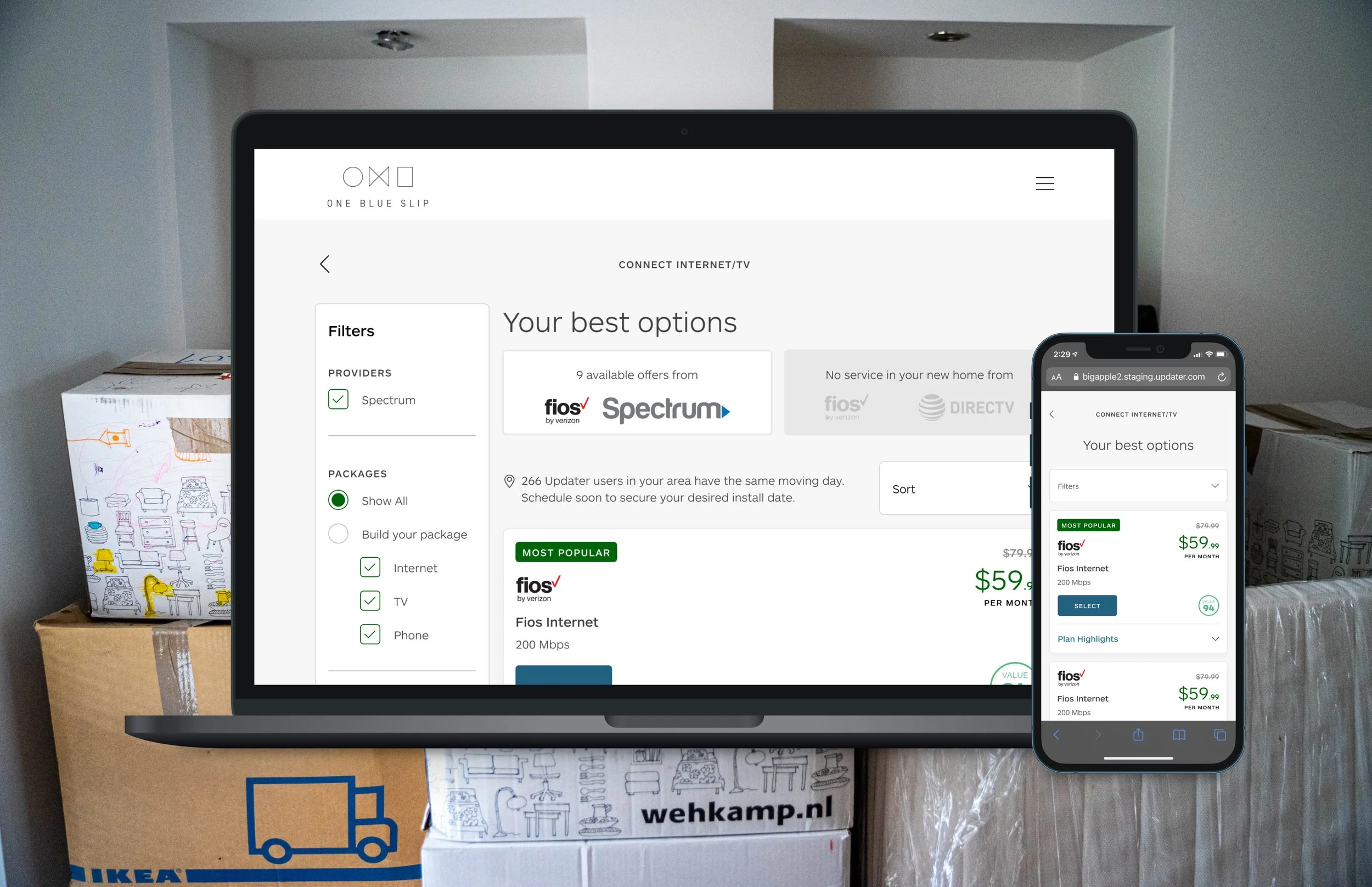 Updater’s mission is to make moving a more enjoyable experience. They do so by consolidating all your critical moving needs into one area and customize it to your needs based on their incredibly powerful data platform and partner integrations. Think forwarding your mail, signing up for renters insurance, and setting up your TV/Internet experience. Historically, you could only buy TV/Internet service directly through the provider website or through theirs or 3rd party call centers. I aimed to digitize the online purchase experience by leveraging our provider partners’ APIs. This had never been done before.