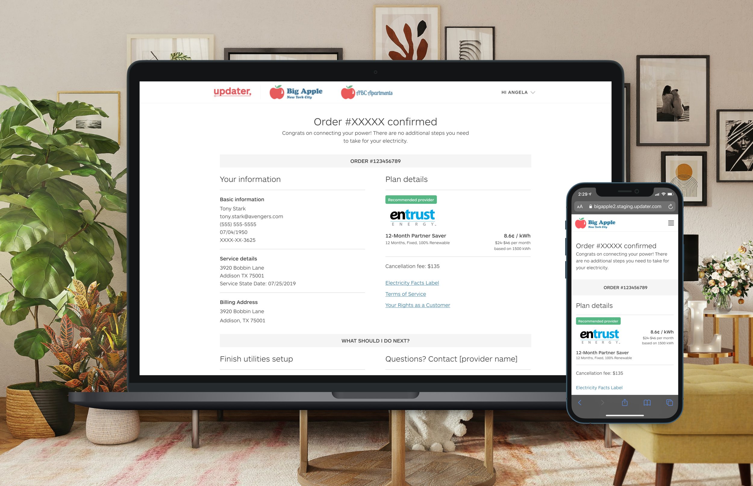 In order to keep things consistent across the Updater experience, I leveraged existing patterns for our shop and enrollment experiences. This continuity reduced the cognitive load when going through different experiences on Updater’s platform. We also mimicked standard utility sign up practices, and pre-filled as many form fields as possible to make the process feel smart, fast, and easy.